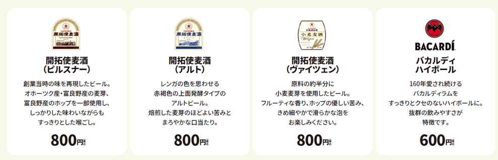 札幌開拓使麦酒醸造所で製造した数量限定の「開拓使麦酒」3種類や「バカルディハイボール」をご提供します。サッポロファクトリー内の飲食店のテイクアウトメニューも各店舗で販売しビールと共に気軽にお楽しみいただけます。札幌開拓使麦酒醸造所見学会と試飲ワークショップも開催します。