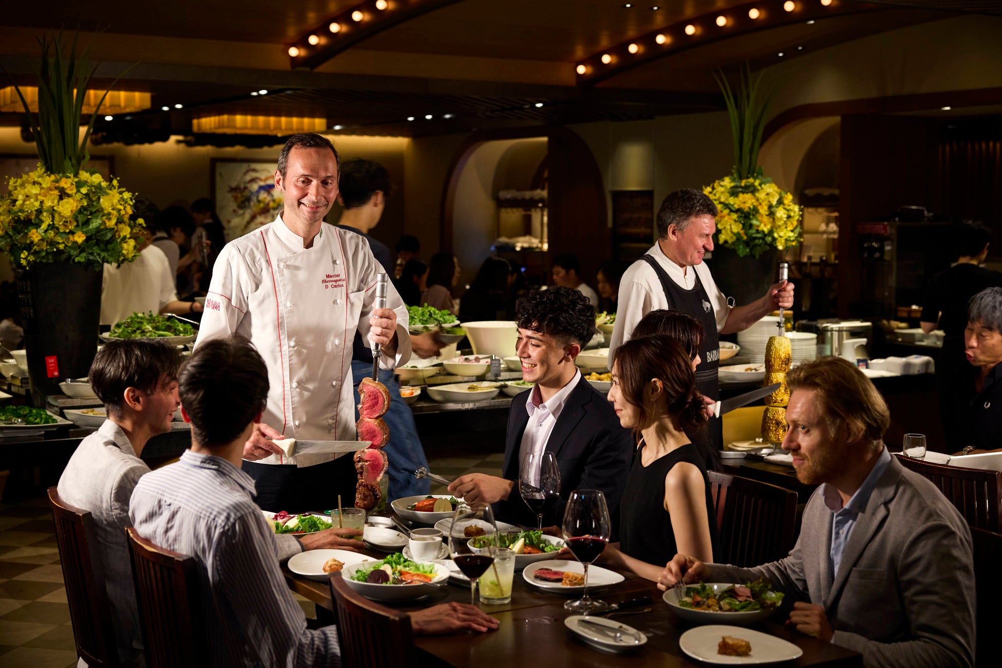 シュラスコとは、ブラジリアンバーベキューのことです。塊のまま串に刺し岩塩のみで焼き上げたジューシーなお肉を、「パサドール」と呼ばれる肉専門スタッフがそのままの状態でテーブルまでお持ちし、お客様の目の前でお好きな部分をお好きなだけ切り分けてご提供するスタイルのバーベキューです。岩塩のみのシンプルな味付けで、油を一切使わずに焼き上げる為、肉の余分な脂も落ちてとてもヘルシーです。