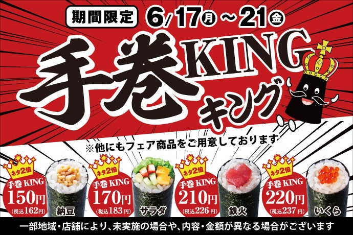 持ち帰り寿し店の「⼩僧寿し」「茶⽉」を運営する株式会社⼩僧寿しは、持ち帰り寿し店「⼩僧寿し」にて、6月17日(月)~21日(金)の期間限定で、「手巻KING」を開催致します。