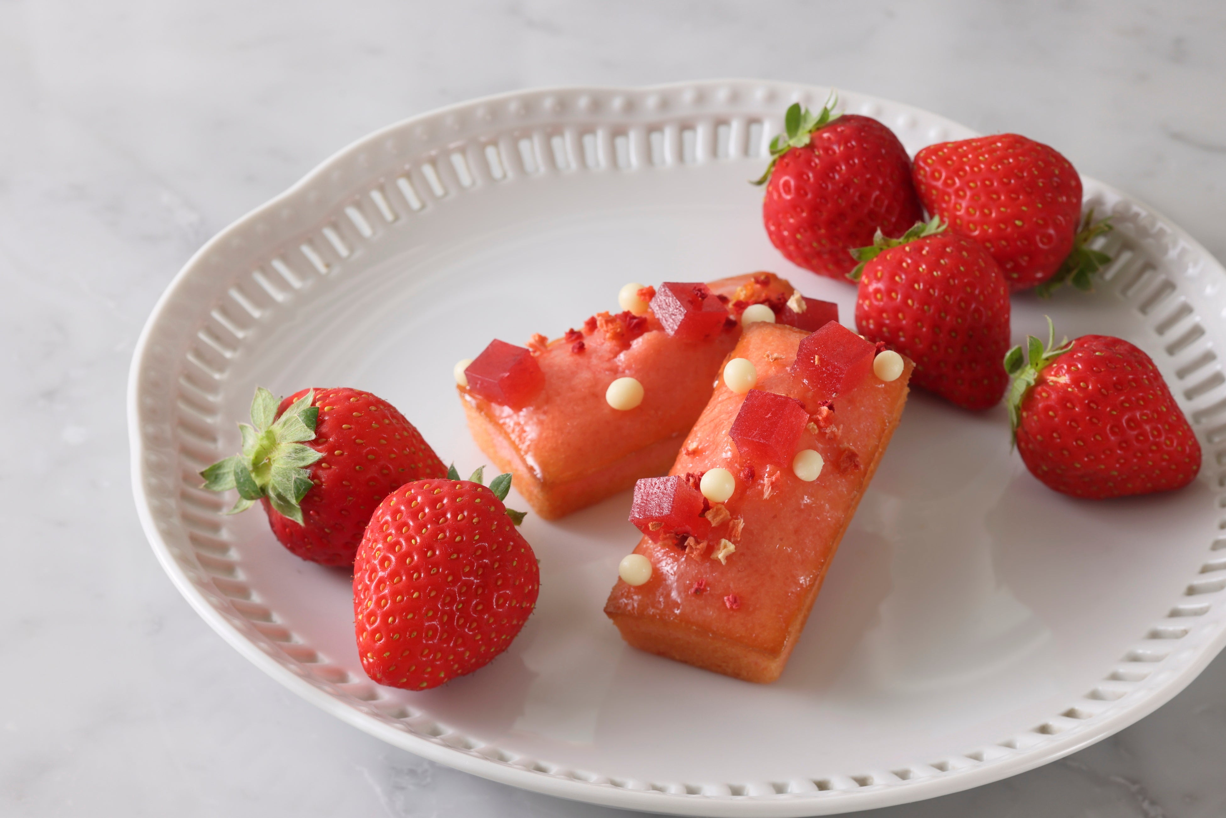 兵庫県のブランドいちご「二郎いちご」を使った逸品。二郎いちごのみずみずしさが活きたピューレと、風味を凝縮したペーストをフィナンシェ生地に使用しました。