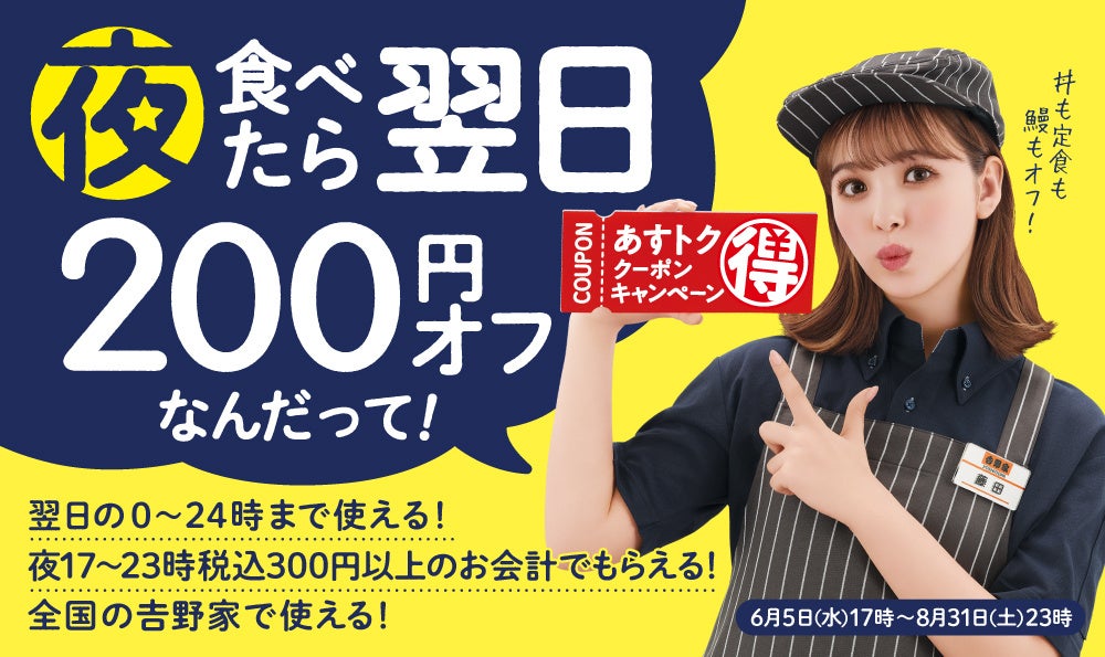 全国の吉野家店舗※では、6月5日(水)17時から8月31日(土)23時までの期間、夜食べたら翌日が200円オフとなる「あすトククーポン」キャンペーンを実施しています。17時から23時までの間に税込300円以上の会計をされたお客様には、翌日のお食事が税込200円オフとなるレシートクーポンをレジにて発行します。吉野家は現在、「牛丼」を中核商品としながら、から揚げ・朝食・牛カルビ丼・定食・サラダ・鰻・カレーなど60種以上のお食事メニューを提供しています。日常食の担い手として、幅広い商品を取り揃え、お好きな商品をお手頃な価格で提供することで皆様の生活を応援します。