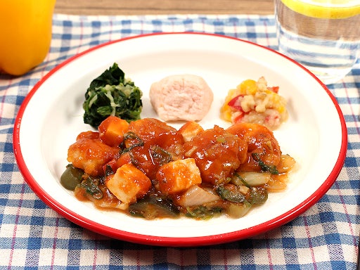 和のシェフこだわりの餡かけメニューが登場!コクと旨み、辛さ、酸味のバランスが絶妙に調和しております。なめらかな豆腐と香ばしく揚げた海老に、餡をたっぷりと絡めて食べてほしい逸品です。副菜はほうれん草のあえ物、かに豆腐、赤ピーマン・黄ピーマン入りのぽん酢ポテトです。