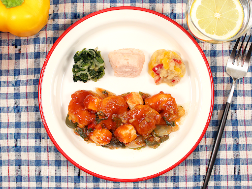 和のシェフこだわりの餡かけメニューが登場!コクと旨み、辛さ、酸味のバランスが絶妙に調和しております。なめらかな豆腐と香ばしく揚げた海老に、餡をたっぷりと絡めて食べてほしい逸品です。副菜はほうれん草のあえ物、かに豆腐、赤ピーマン・黄ピーマン入りのぽん酢ポテトです。