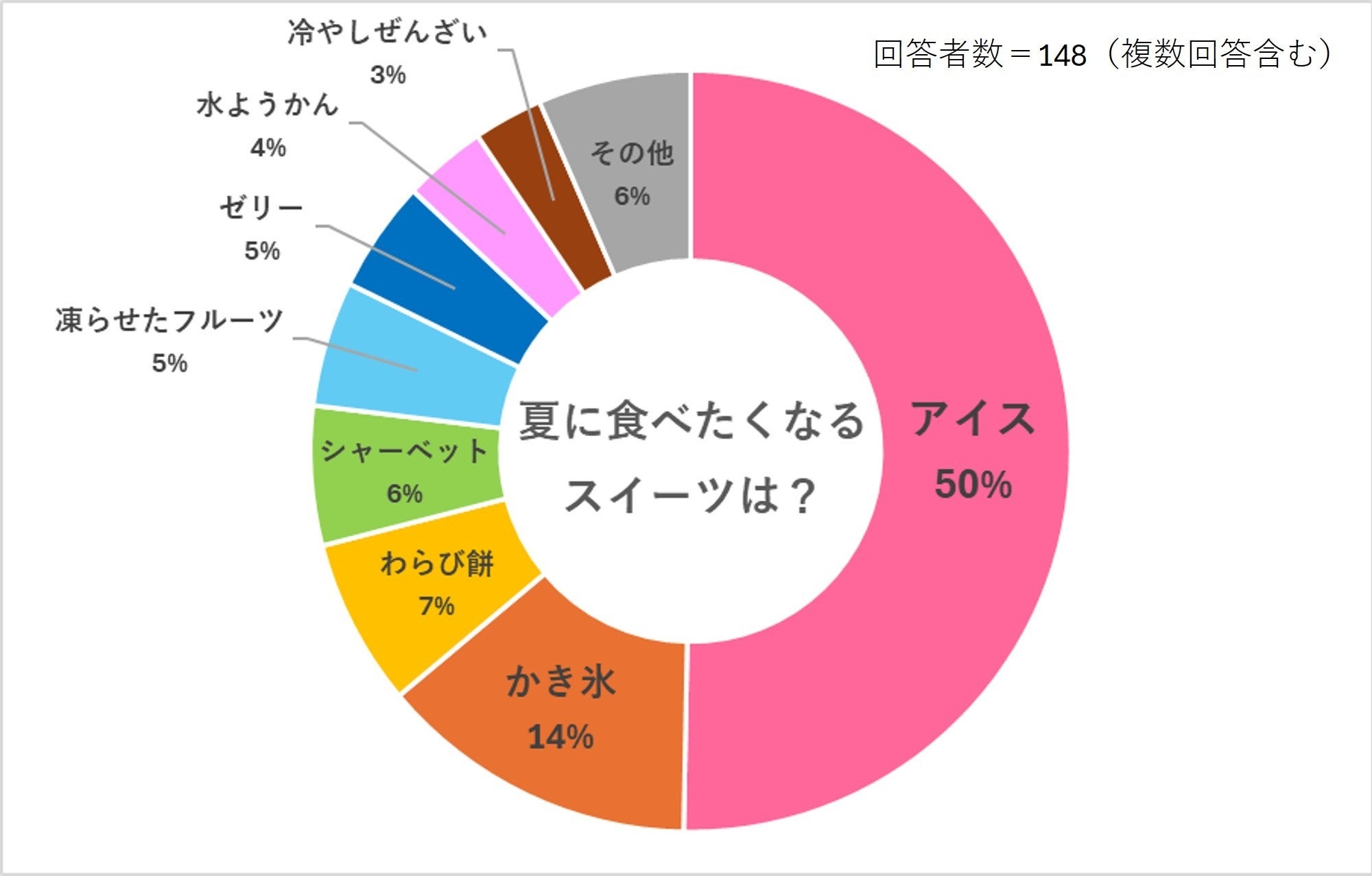 アイスの回答が半数を占め1位でした。アイスの中には、ソフトクリームやモナカアイスなど、さまざまな種類のものが含まれているようです。