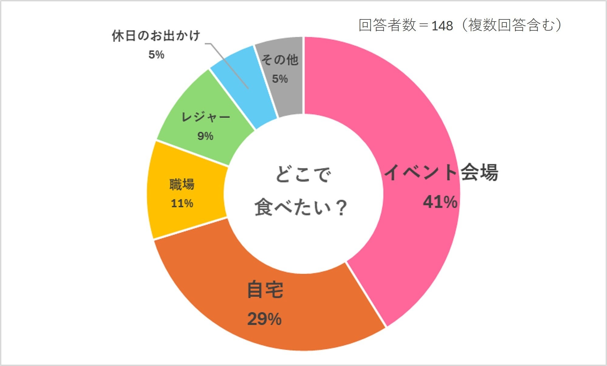 屋外で過ごすイベント会場やレジャー先で食べたいが約半数で一番多かった。落ち着ける場所である自宅や職場の仲間と楽しみたいという意見も多く見られました。