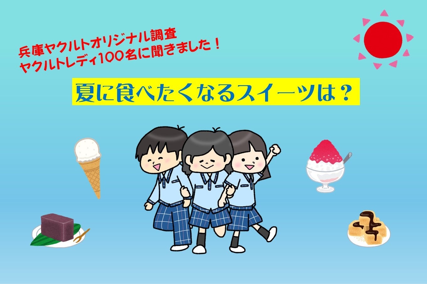美味しいスイーツは、幸福感や人生の活力を得るための癒しの1つと考える方も多いかと思います。例年続く厳しい暑さの中、冷たいスイーツが好まれる夏の季節に一番食べたくなるスイーツは何か、社内調査を実施。働く女性に喜ばれるスイーツは何か、夏に食べたくなるスイーツについて、ヤクルトレディ148名にアンケート調査を実施しました。