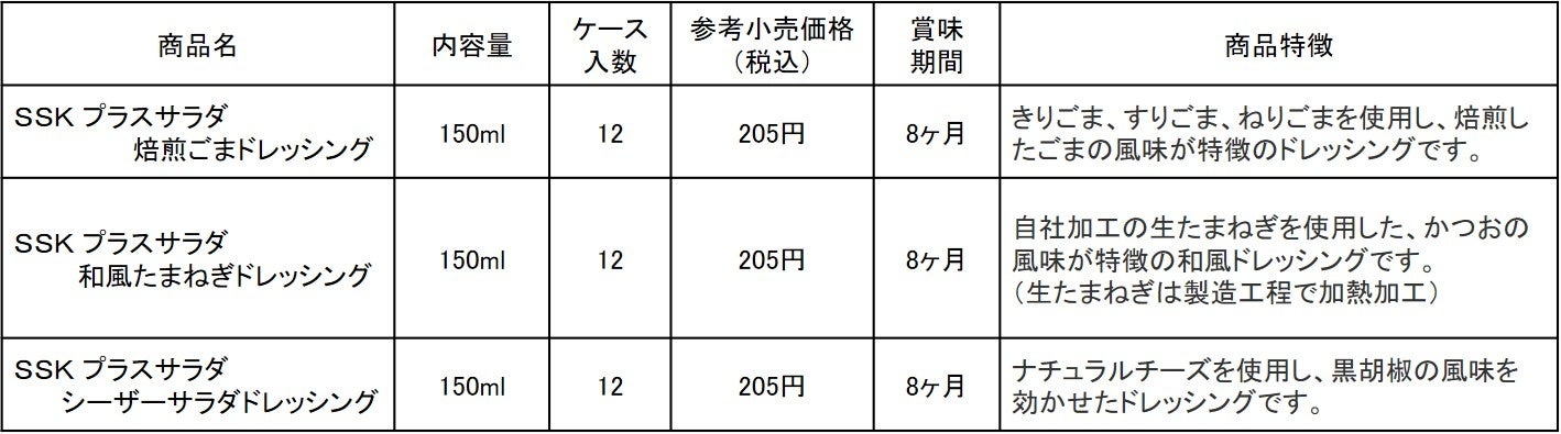 エスエスケイフーズ株式会社(本社:静岡市葵区)は、「SSKドレッシング プラスサラダシリーズ」から新たに150mlのお手頃サイズの商品3品を発売致します。