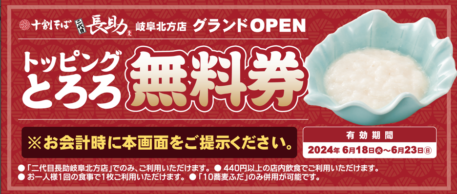 また、岐阜北方店限定でご利用いただける「トッピングとろろ無料券」を記載いたしました。この画面を掲示で期間中、何度でもご利用いただけます。