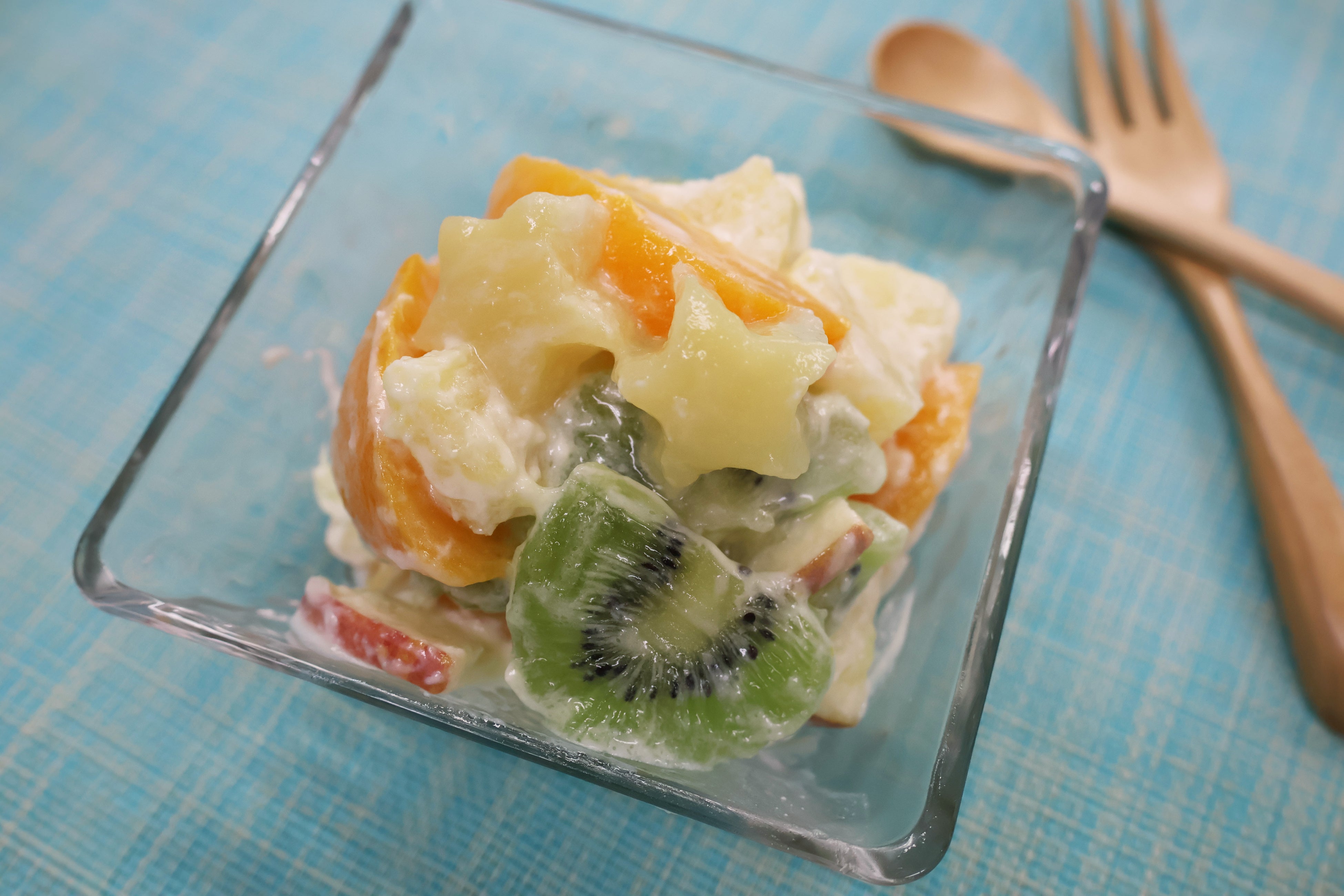 キウイ、りんご、パイン、黄桃に、季節限定で白桃を加え、コク深くマイルドな甘さの練乳ソースを絡めたサラダです。大人気のフルーツサラダで初めて、七夕にちなんだ星形の白桃をトッピング。かわいらしい見た目が食卓を彩ります。
