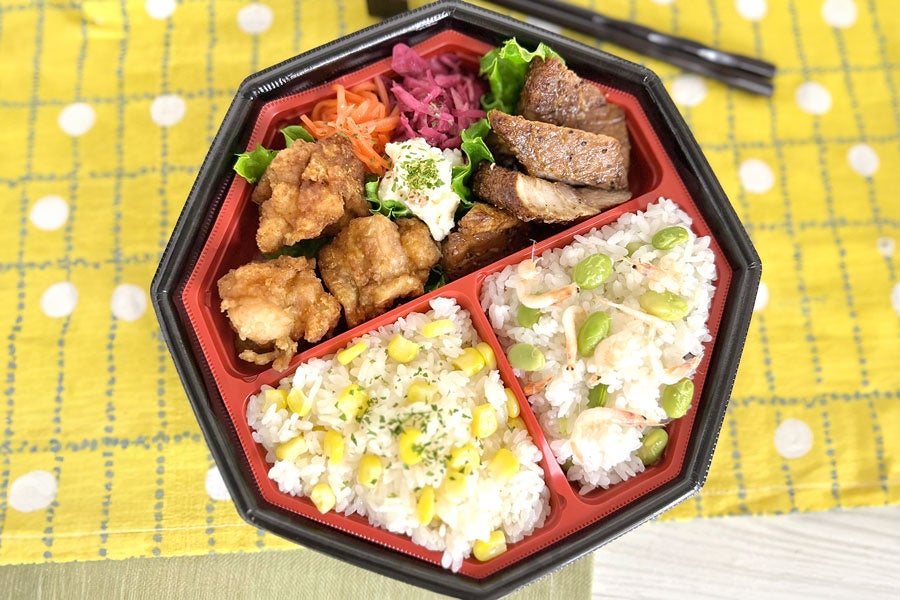Salad Cafe青葉台東急フードショー店で6月19日(水)から6月25日(火)までの期間限定で販売するのは、『初夏を楽しむ!唐揚げ&スペアリブ弁当』です。青葉台東急フードショーの特別企画“東急百貨店創業90周年記念1,090円弁当”に向け、開発しました。八角形の容器に、2種類の混ぜ込みご飯と手作り唐揚げ、スペアリブを入れたボリューム満点のお弁当です。混ぜ込みごはんは、初夏が旬の食材を使った、コーンの甘みを感じるバター風味のとうもろこしご飯と、桜えびの風味を楽しむ枝豆ご飯。醤油とにんにくの風味がきいた旨味たっぷりの唐揚げと黒胡椒がきいたスパイシーなスペアリブをはじめ、副菜のラペやサラダでも、サラダカフェならではのこだわりをお楽しみいただけます。販売期間中、各日とも午前中10折、夕方10折の20折限定です。