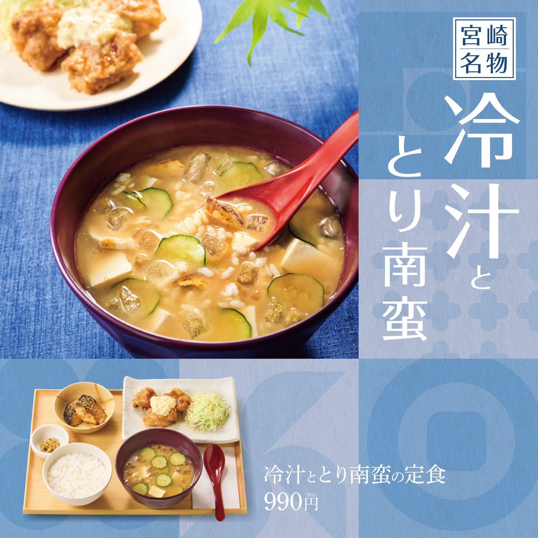 このたび「やよい軒」では、夏限定の定番メニューとして、宮崎県の郷土料理を堪能できる、梅雨の蒸し暑い時期にぴったりな“冷汁(ひやじる)”と、“とり南蛮”を組み合わせた『冷汁ととり南蛮の定食』990円を発売いたします。定食のみそ汁を190円で『冷汁』に変更できるほか、単品でもお楽しみいただけるよう『冷汁(単品)』290円も発売します。