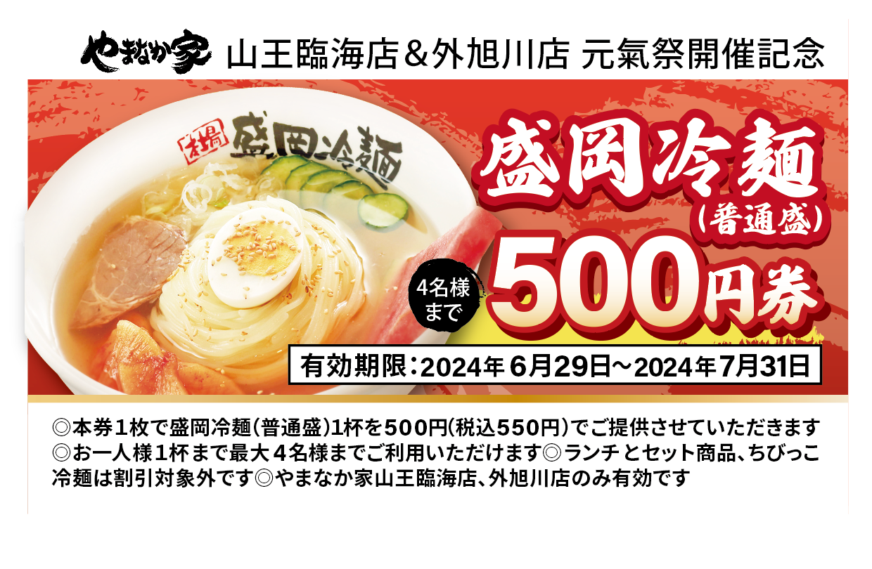 さらに期間中ご来店のお客様には、次回利用できる【盛岡冷麺[普通盛]500円券】を★無料プレゼント★各店先着1,000枚(1組様に1枚無料配布)