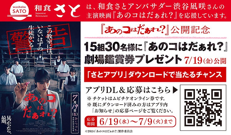 和食さと公式アプリをダウンロードし、専用の応募ページに必要情報を入力して応募すると、7月19日(金)公開の映画「あのコはだぁれ?」の劇場鑑賞券(15組30名様)が抽選で当たるプレゼントキャンペーンです。