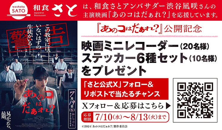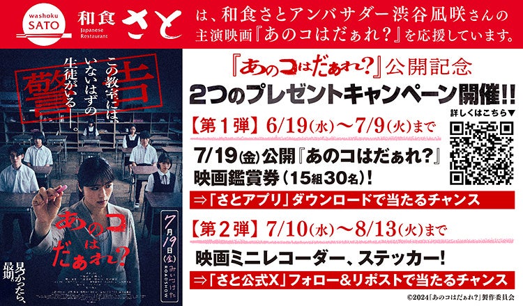 国内197店舗を展開する「和食さと」では、公式アンバサダー『渋谷凪咲』さんが初主演となる映画「あのコはだぁれ?」とのタイアップイベントとして、劇場券鑑賞券や映画非売品グッズが当たるプレゼントキャンペーンを開催します。