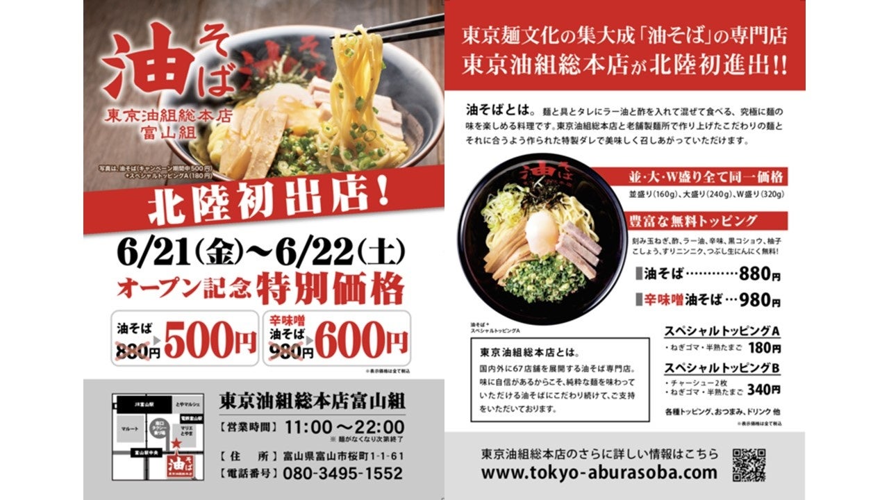 オープンを記念し、2024年6月21日(金)、22日(土)の2日間、「油そば」 500円(税込)、「辛味噌そば」 600円(税込)でお召し上がりいただける、“オープン記念キャンペーン” を実施いたします! ※並盛り・大盛り・W盛り全て同一価格(東京油組総本店 富山組のみで実施)