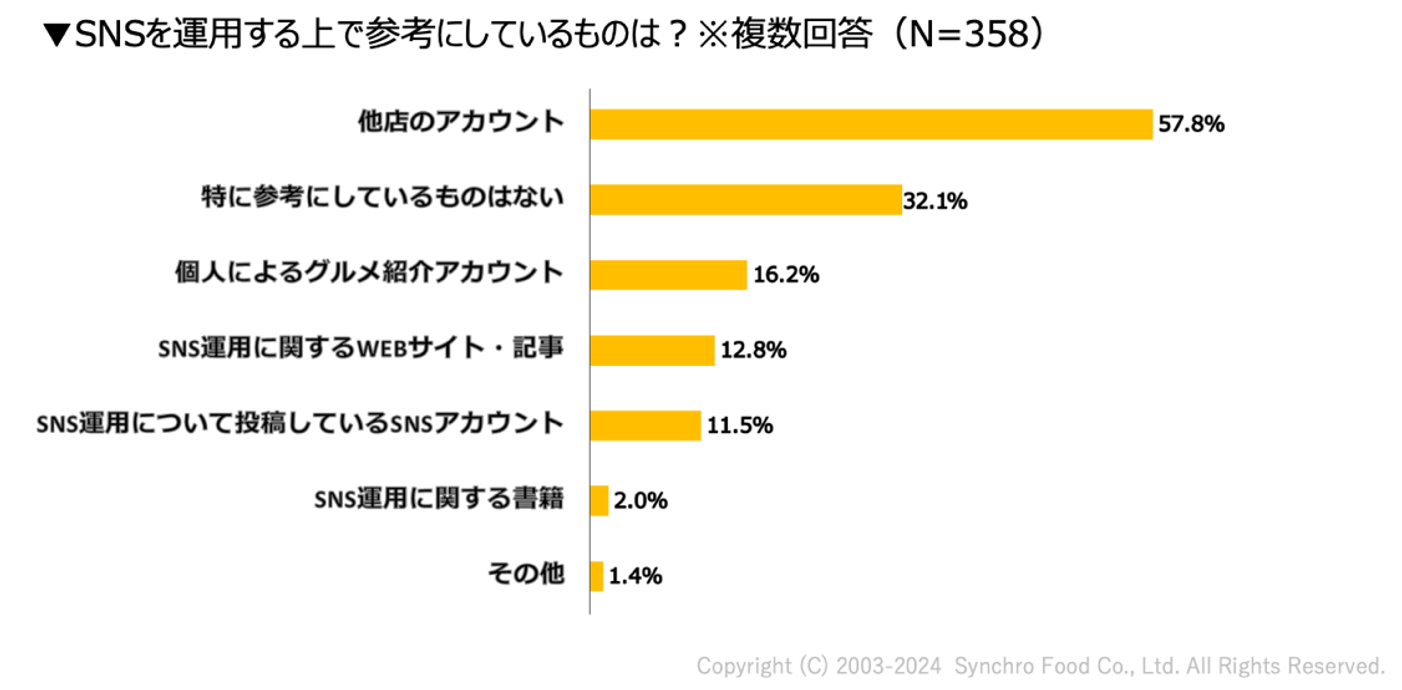 また32.1%が「特に参考にしているものはない」と回答したものの、26.3%が「SNS運用に関する何らかの情報(SNS・Web記事・書籍など)」と回答しており、戦略的な運用を目指す飲食店も少なくないことがわかりました。