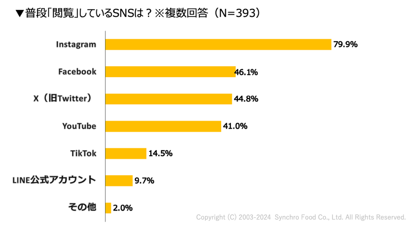最後に、日頃どのようなSNSを閲覧しているか尋ねたところ、最も多かったのは79.9%の「Instagram」。続いて「Facebook(46.1%)」「X(旧Twitter)(44.8%)」「YouTube(41%)」という結果になりました。YouTubeは投稿する人の割合は少なかったものの、閲覧利用の割合は4割以上あることがわかりました。