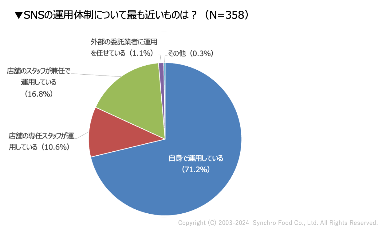 次に、開設しているSNSアカウントの運用体制について尋ねたところ、最も多かったのは「自身で運用している(71.2%)」という回答でした。「外部の委託業者に運用を任せている」と答えたのは全体の1.1%という結果になり、98.6%の飲食店が自店で運用していることがわかりました。