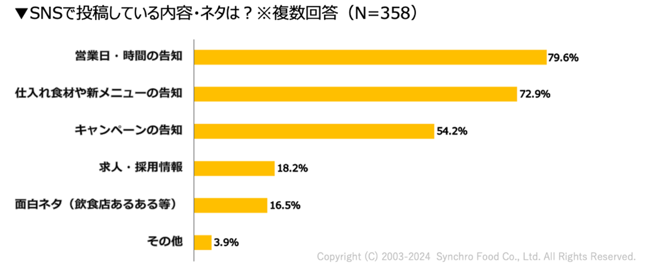 続いて、自店のSNSアカウントでどのような内容を投稿しているか尋ねたところ、「営業日・時間の告知」が最多(79.6%)となり、次に「仕入れ食材や新メニューの告知(72.9%)」「キャンペーンの告知(54.2%)」と回答が続きました。
