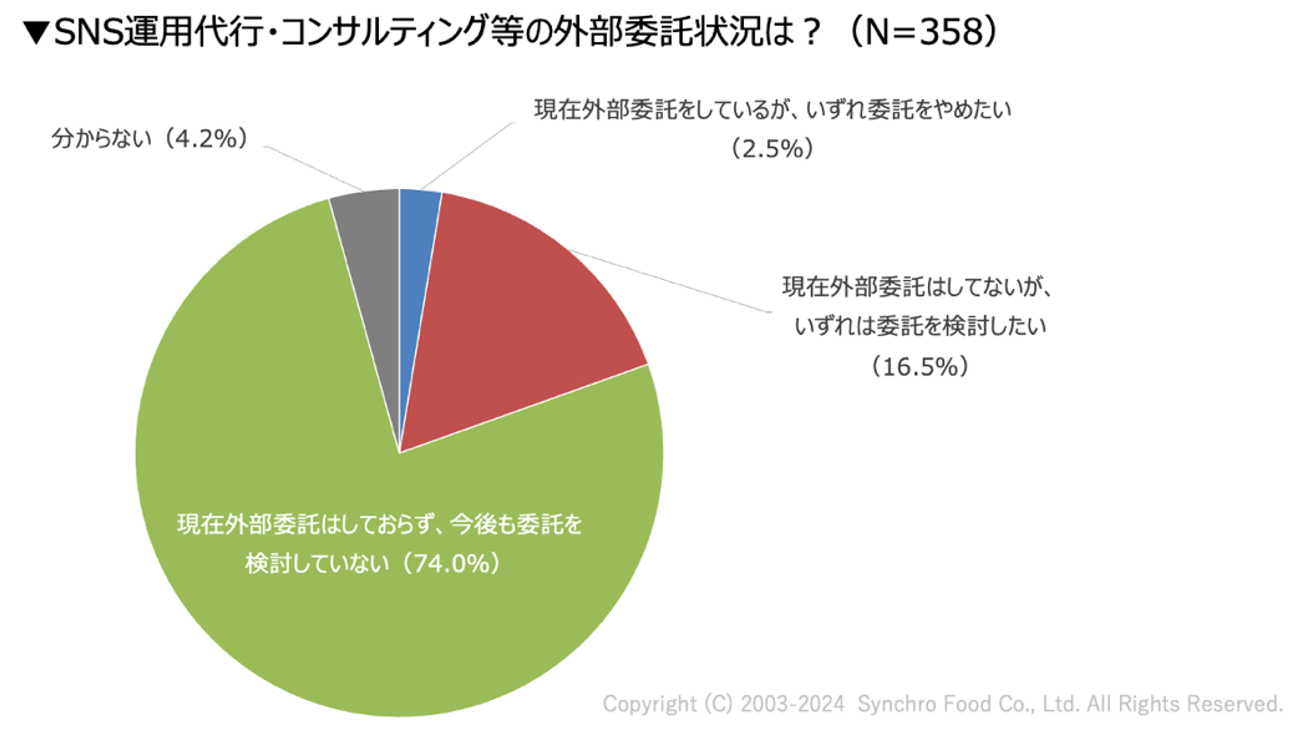 次いで、SNSアカウントの運用やコンサルティングなどの外部委託に関して、現状と今後の見通しを聞いたところ、最多の74%が「現在外部委託はしておらず、今後も委託を検討していない」と回答しました。