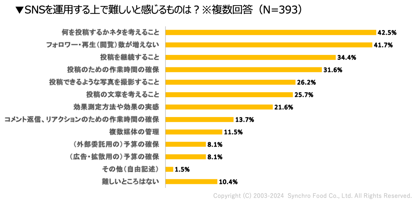 また、SNSアカウントを運用する上で難しいと感じることをすべて選んでもらったところ、最も多かったのは「投稿の内容やネタを考えること」で42.5%。次いで「フォロワー・再生(閲覧)数の獲得(41.7%)」「投稿の継続(34.4%)」「投稿のための作業時間の確保(31.6%)」と続く結果となりました。