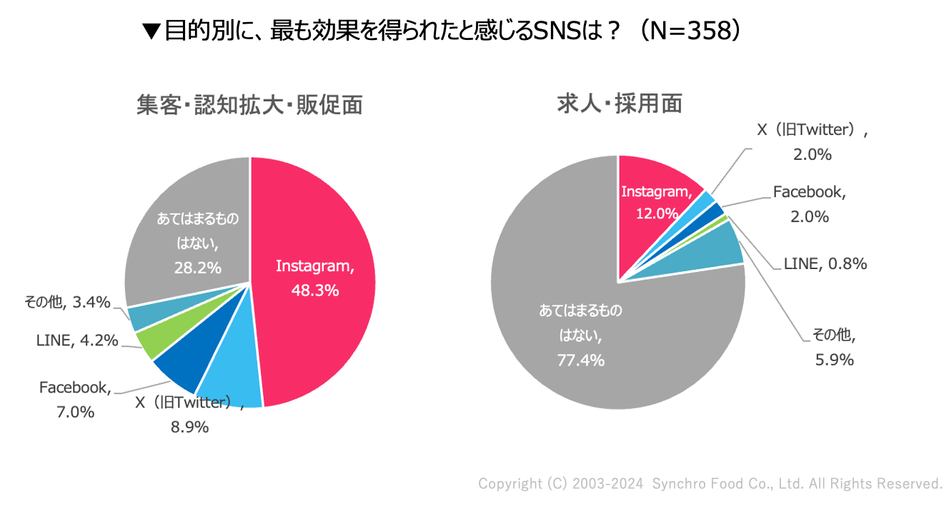 その上で、目的別に最も効果を得られたと感じるSNSを選んでもらったところ、集客・認知拡大・販促面に関しては「Instagram」(48.3%)が最も多く、求人・採用面においては77.4%が「SNSで当てはまるものはない」と回答したものの、12%は「Instagram」を挙げる結果となりました。