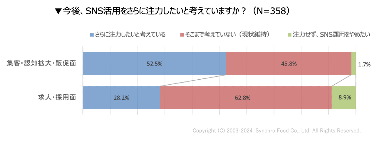 また、今後SNS活用をさらに注力していきたいか尋ねると、集客・認知拡大・販促面においては52.5%が、求人・採用面に関しては28.2%が「さらに注力したいと考えている」と回答しました。
