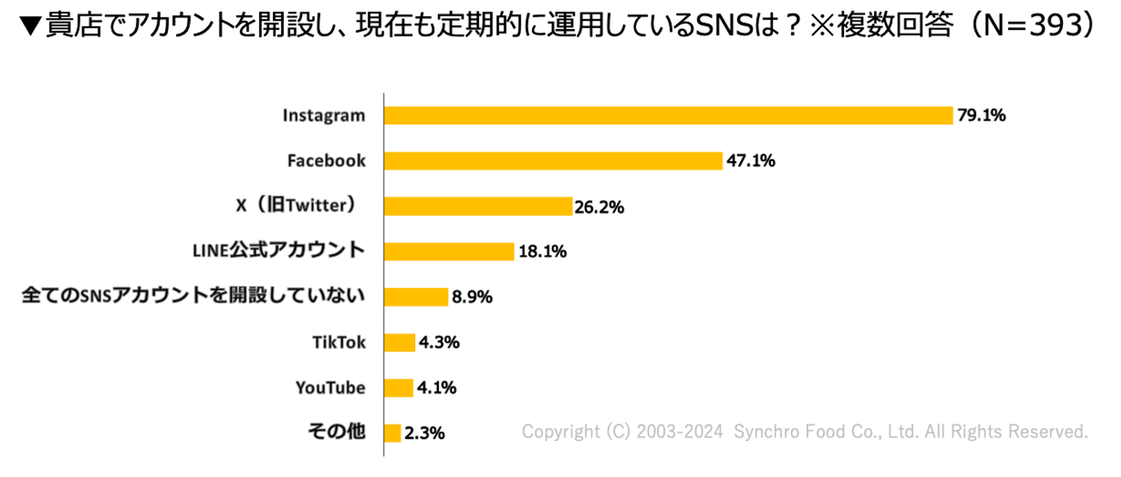 まず、現時点で定期的に運用している自店アカウントのSNSをすべて選んでもらったところ、最多は「Instagram」で79.1%、次いで「Facebook(47.1%)」「X(旧Twitter)(26.2%)」「LINE公式アカウント(18.1%)」という結果になりました。