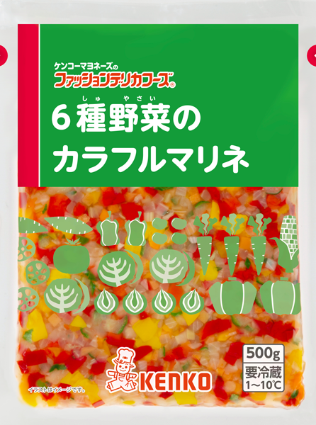 彩りの良い6種類の野菜を5mm程度に角切りにし、白ワインビネガーとハーブの風味でほんのり味付けをしたマリネです。具材を揃える、カットする、調味するなどの手間をかけることなく、メニューを華やかに仕上げることができます。色合いだけでなく、具材の品目数も増やすことができるため、満足感にもつながります。