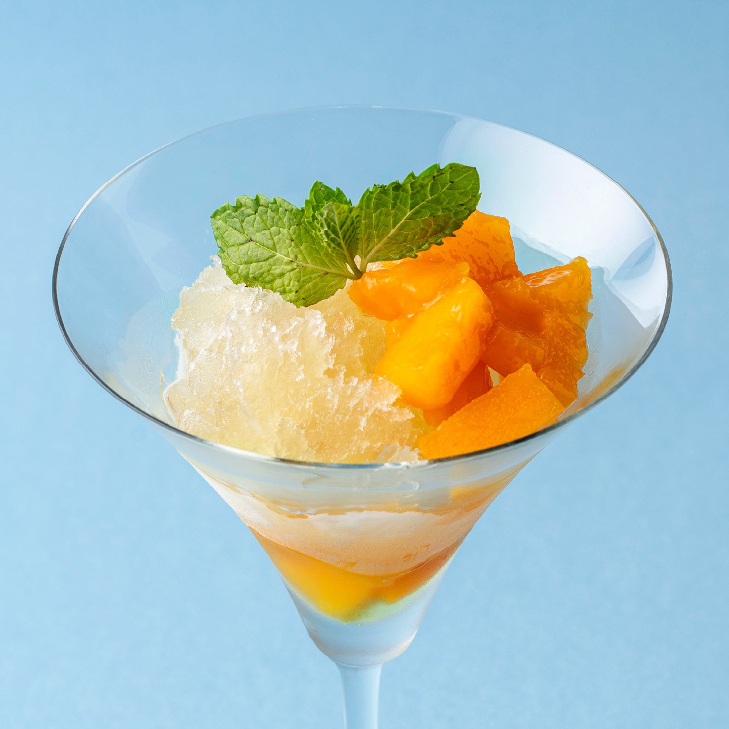 フランス・ソーテルヌ地方の貴腐ワインを凍らせてグラニテにした大人のかき氷。今年は鹿児島県産のマンゴーを組み合わせて、夏らしく仕上げました。甘さの中に爽やかな酸味とほろ苦さを感じる甘口貴腐ワインとマンゴーの相性は抜群。口当たりも優しく、カクテル感覚で楽しめる一品です。