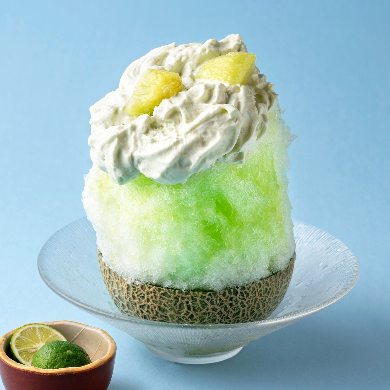 毎年人気を誇るメロンを丸ごと使用したかき氷に、今年は京都の粉山椒を使ったエスプーマと高知県産のすだちをアクセントに。ジューシーなメロンの旨味と粉山椒の上品な香りが見事に調和し、別添えのすだちを絞ればサッパリとした味わいへ。意外な組み合わせが生み出す奇跡のバランスを堪能してみて。
