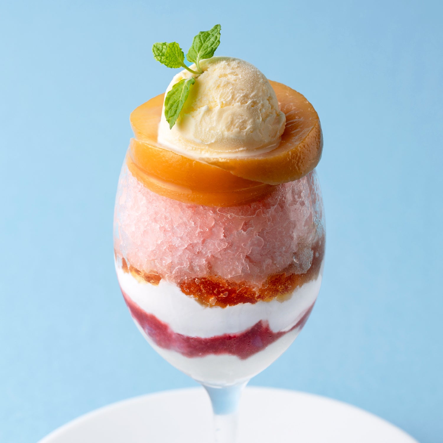 旬の桃を主軸に据えたパフェ風かき氷。島根県産の和紅茶と桃のコンポートとジュレ、ホワイトバルサミコが隠し味の桃とローズマリーのグラニータ、桃のパンナコッタにホイップクリーム、アクセントにフランボワーズのソースを添えた6層で構成。異なる味の層が織りなすハーモニーをお楽しみください。