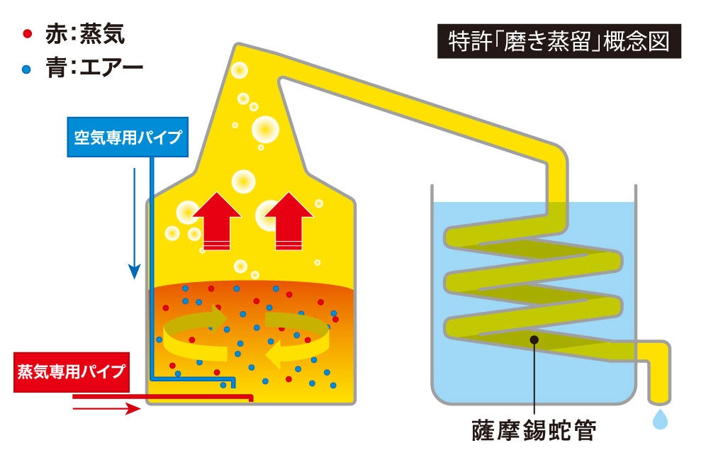 蒸留機の釜底部に新鮮な空気を送り込む専用パイプを装着し、蒸留中のもろみに空気を満遍なく行き渡らせ対流を発生させることで、蒸留釜内部の安定均一化を実現した独自の蒸留技術です。この技術により、原料特有のコク、旨み、香りなどを、なめらかでかろやかな味わいへと仕上げていきます。蒸留中に「もろみを磨く」ような状態をつくりだす。このことから「磨き蒸留」と名付けました。