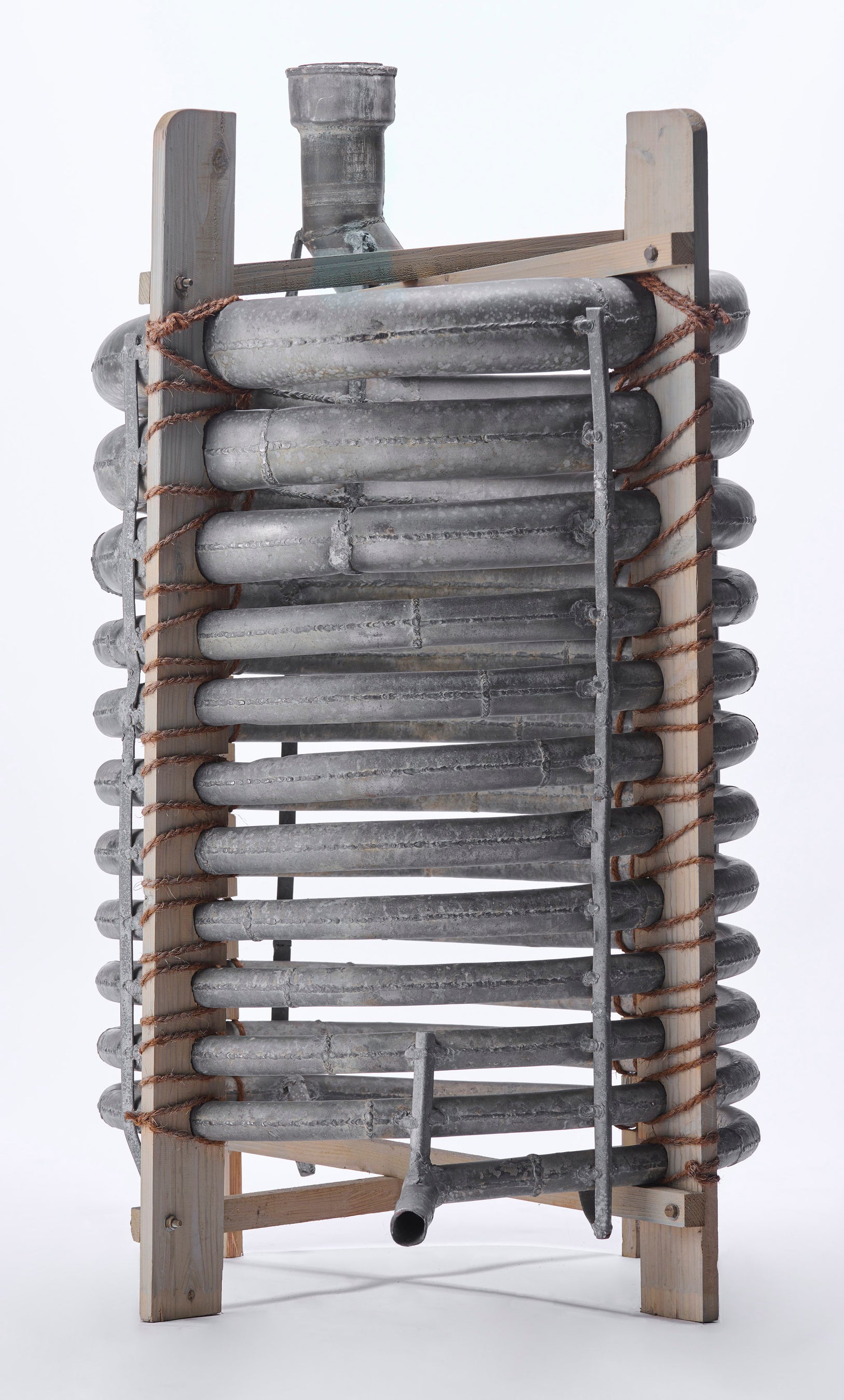 本格焼酎の原酒は、蒸留機で蒸留した蒸気を渦巻状の管(蛇管)を通して冷やされ液体となって出来上がります。
