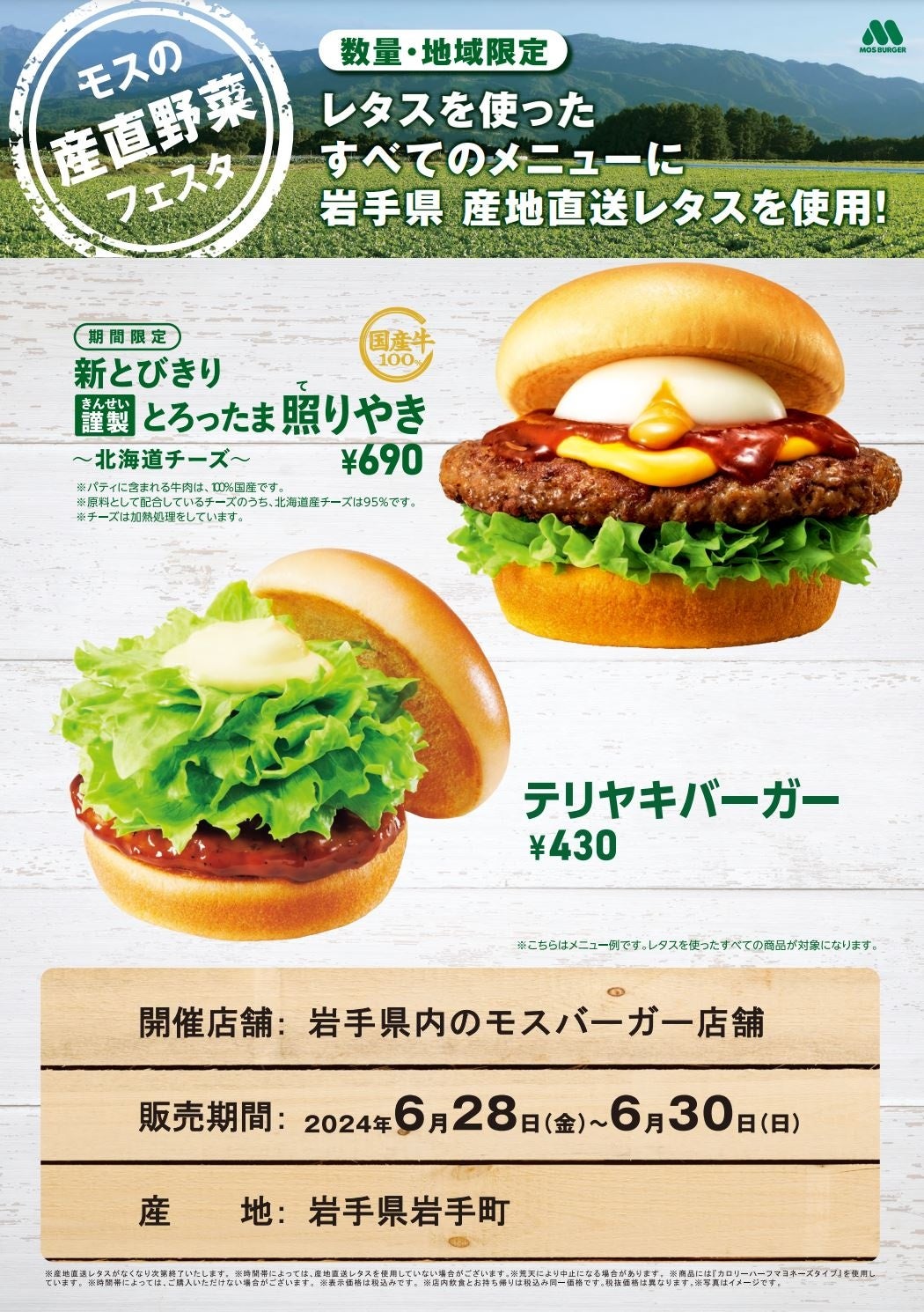 『モスの産直野菜フェスタ』は、2014年より各地で始まったもので、日頃よりモスバーガー店舗をご愛顧いただいている地域の方々やお客さまに感謝の気持ちをこめて、地元のおいしい野菜をこの機会を通じて味わっていただきたく、実施するものです。期間中はモスバーガー店舗で販売しているレタスを使用するすべての商品に、産地直送のレタスを使用します。県内で生産されたレタスの味わいを、ぜひお召し上がりください。