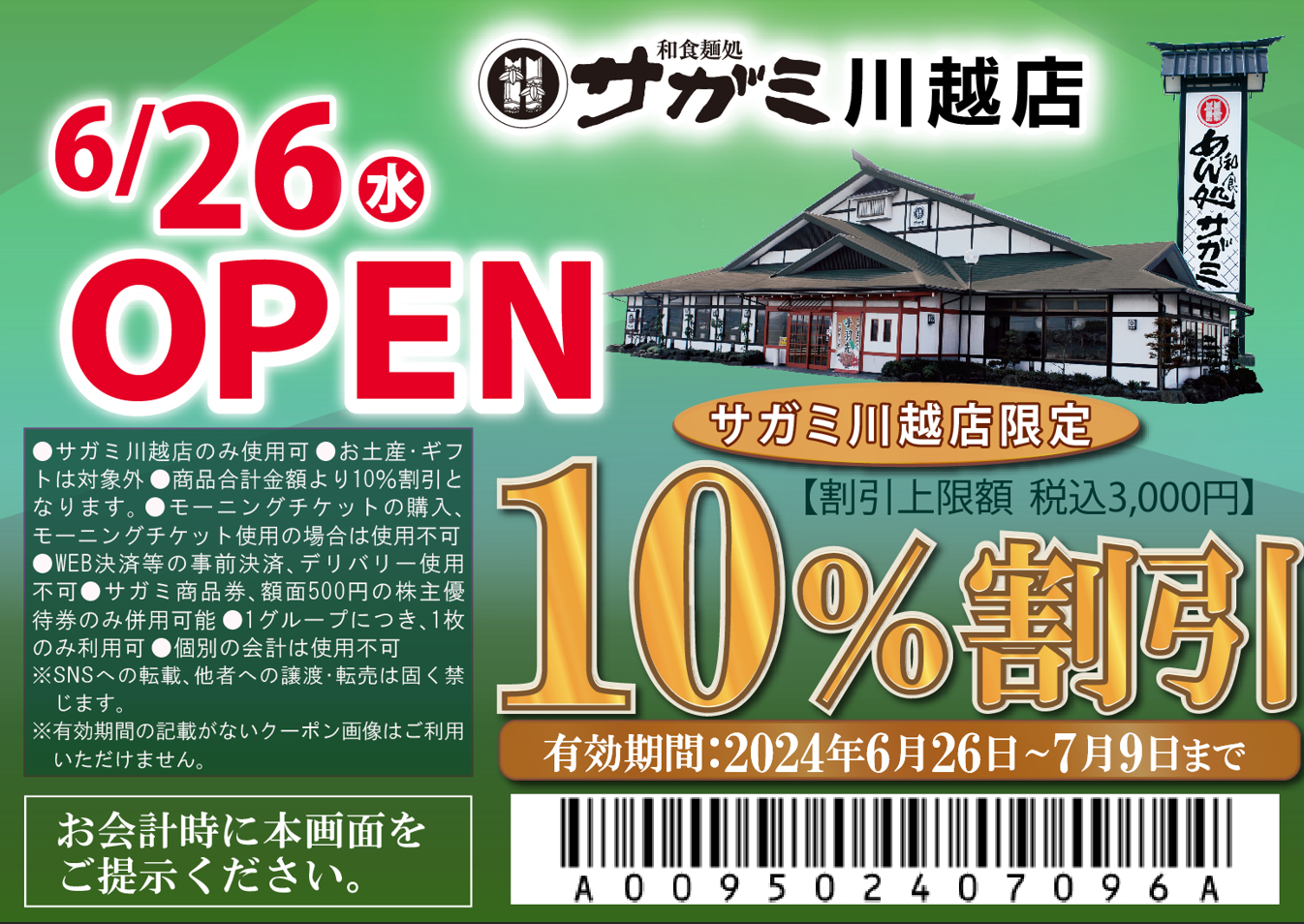 また、和食麺処サガミ川越店限定でご利用いただける割引券【有効期間6月26日(水)~7月9日(火)】を記載いたしました。この画面を掲示で期間中、何度でもご利用いただけます。
