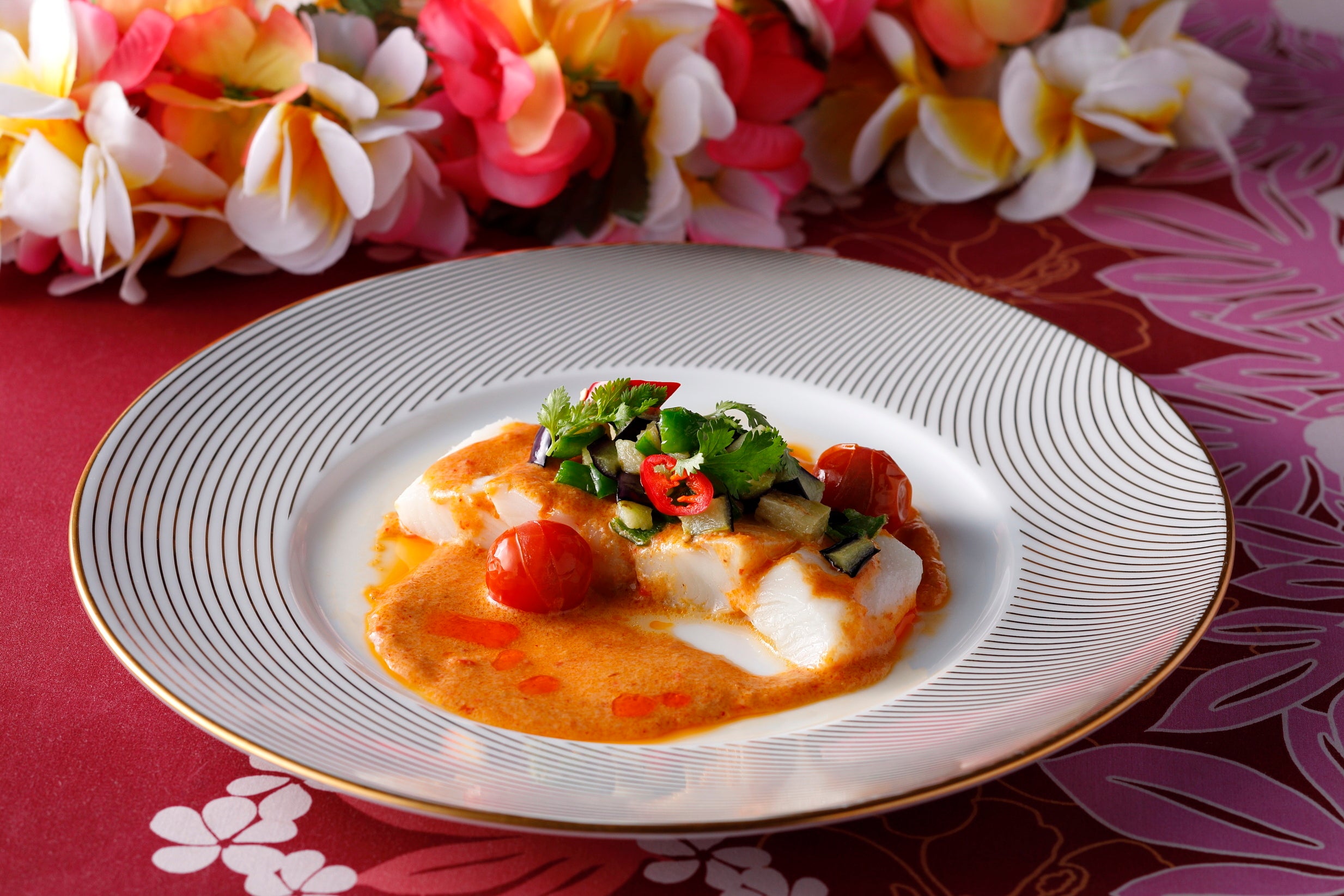 レモングラスやライムリーフの香りを纏わせた、肉厚で繊細なカワハギをふっくらと蒸しました。ココナッツの優しい甘みと唐辛子の辛み、ナンプラーの芳醇な風味が絶妙なスパイシーココナッツクリームソースでお召し上がりいただきます。彩り鮮やかな夏野菜の素揚げとご一緒にお愉しみください。
