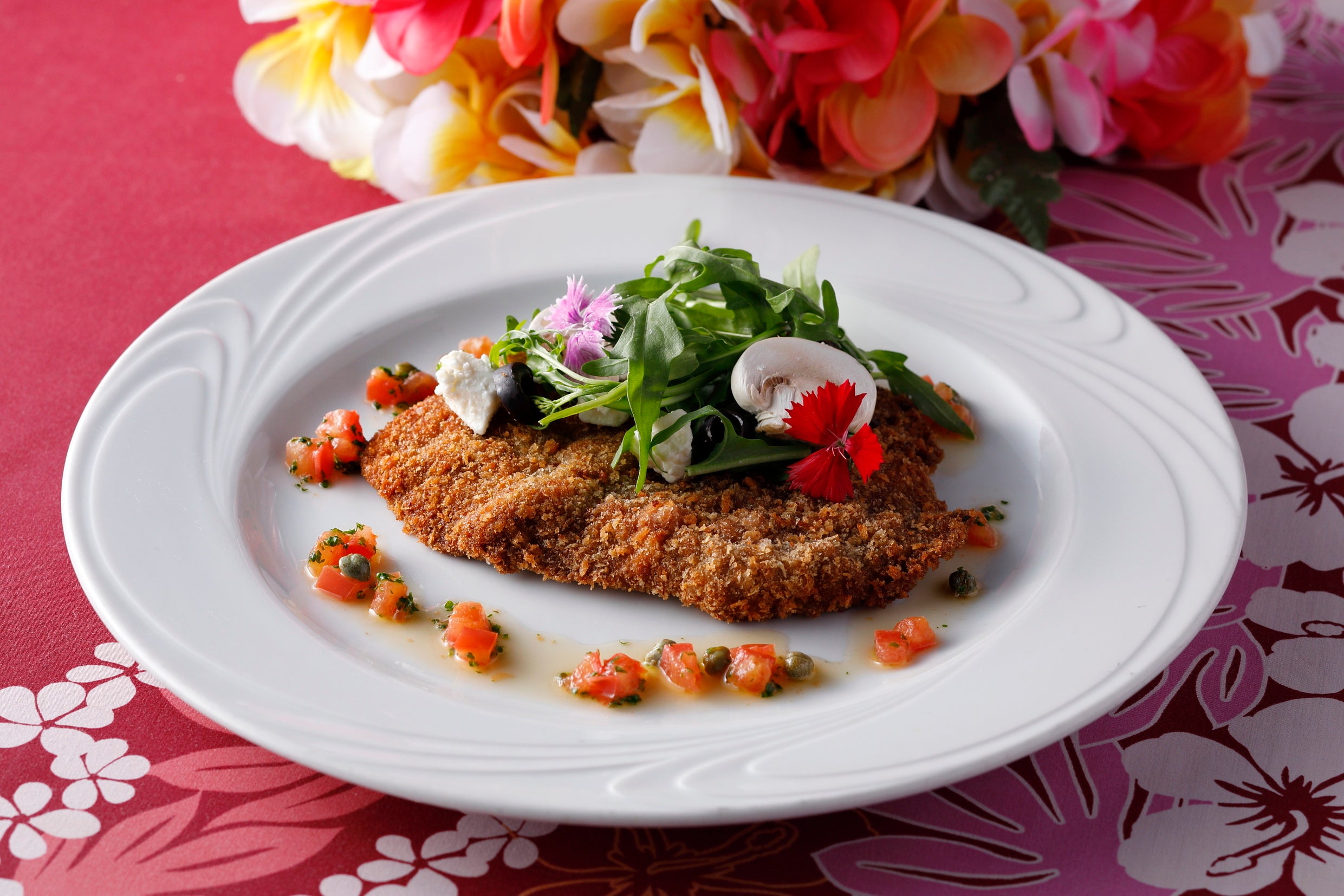 繊細な肉質で、成牛に比べ脂肪が少ないことが特徴の仔牛肉を薄く引き延ばし、すましバターの香り豊かに香ばしく揚げ焼きされたカツレツは、口いっぱいに凝縮された旨みが広がります。オリーブオイルやレモンで味付けられたルッコラや、熟成した濃厚な塩味がクセになるフェタチーズと一緒にお召し上がりください。