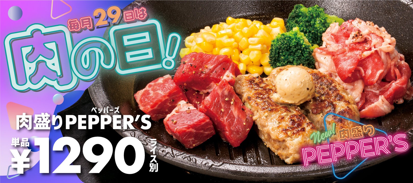 ペッパーランチでは、毎月29日にお得な“肉の日”キャンペーンを開催!オリジナルハンバーグ、牛焼肉、カットステーキがワンプレートで楽しめるよくばりメニュー「肉盛りPEPPER’S」。昨年12月のデビュー以来、大人気のメニューをより多くのお客様に気軽にお召し上がりいただけるよう肉の日限定990円で販売いたします。今月の肉の日もペッパーランチでパワーチャージ♪