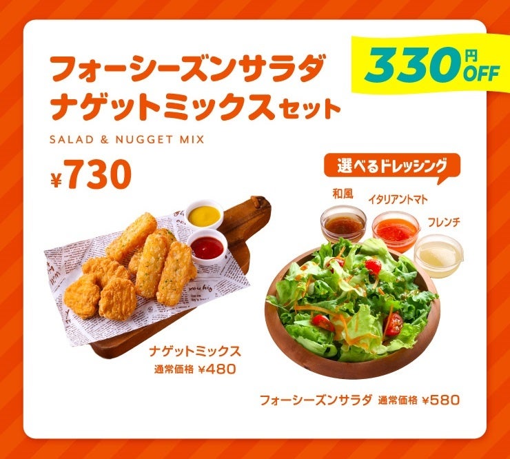 サイドメニューの組み合わせは、定番のナゲットとポテトの組み合わせから、女性に人気のサラダ&ナゲットミックスなど、4種類のラインナップ。