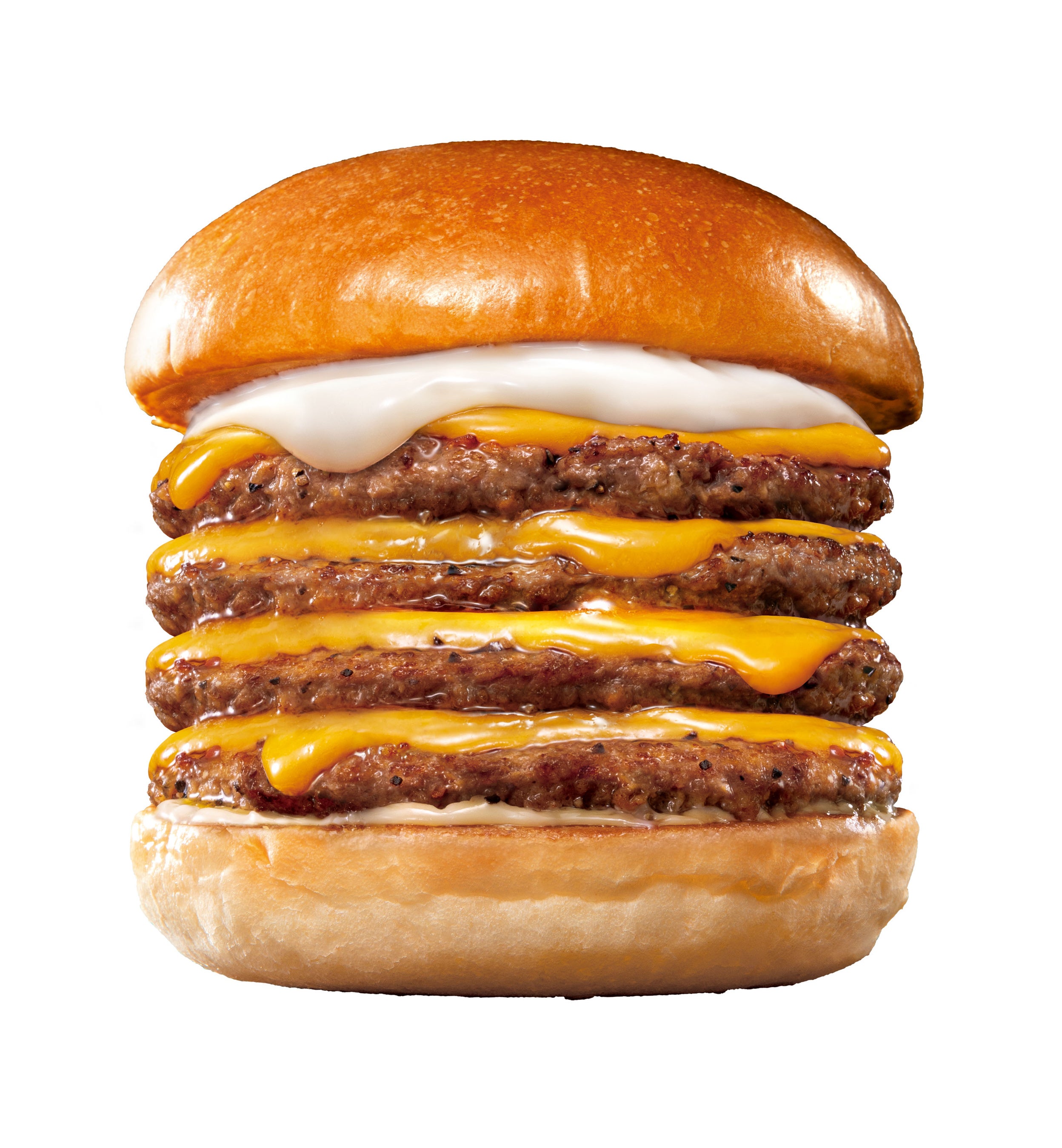 商品概要:粗挽き牛肉100%のパティとレッドチェダーチーズを4枚ずつ重ね、ふんわりもっちり食感が特長のバンズで挟んだ一品です。4種類(ゴーダ・チェダー・マスカルポーネ・パルメザン)のチーズをブレンドしたとろ~りチーズソースにからしマヨの程よい辛さがアクセントになっています。