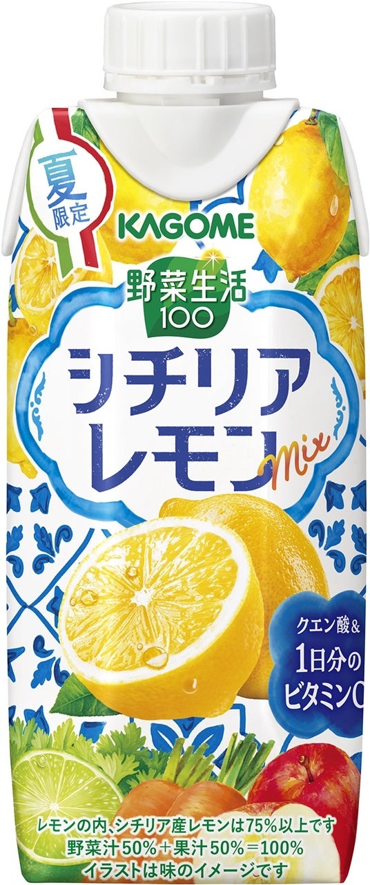 「野菜生活100 シチリアレモンmix」は、酸味と甘味のバランスが良いシチリアレモンの味わいの”夏限定”野菜・果実ミックスジュースです。手摘みのシチリアレモン※1を皮ごと搾り、本格的なピール感と華やかな香りに仕立てました。砂糖は不使用で、クエン酸と1日分のビタミンC※2を摂ることができます。仕事や家事、外出時などの合間でリフレッシュしたい時におすすめです。