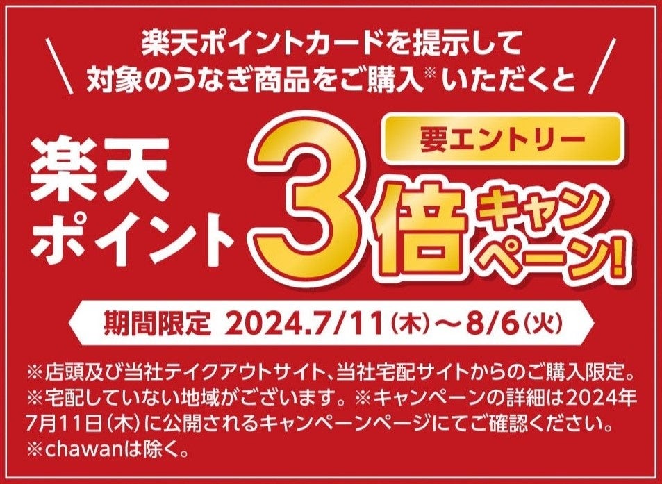 キャンペーン期間中にエントリーのうえ、対象のうなぎメニューのお会計時に、対象店舗で楽天ポイントカードまたは楽天ポイントカード機能が搭載されたアプリをご提示いただくと、楽天ポイントを3倍進呈いたします。