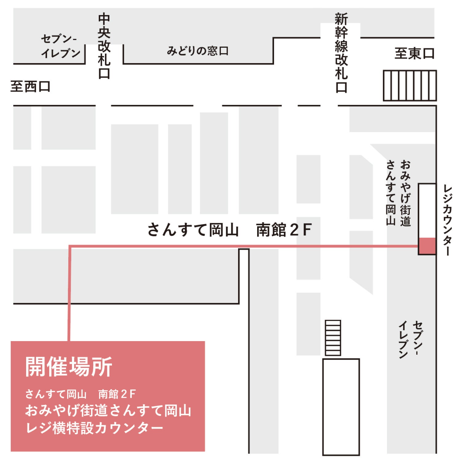 場所:おみやげ街道さんすて岡山レジ横特設カウンター ※下図参照