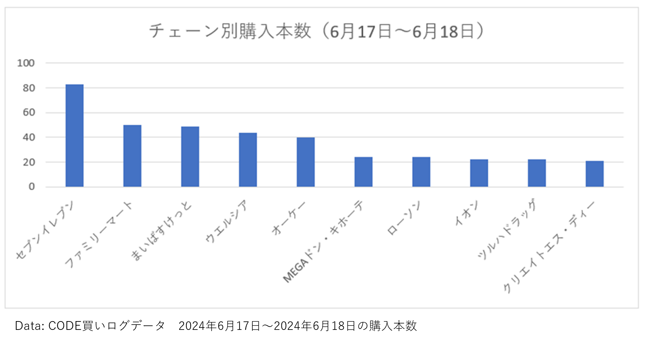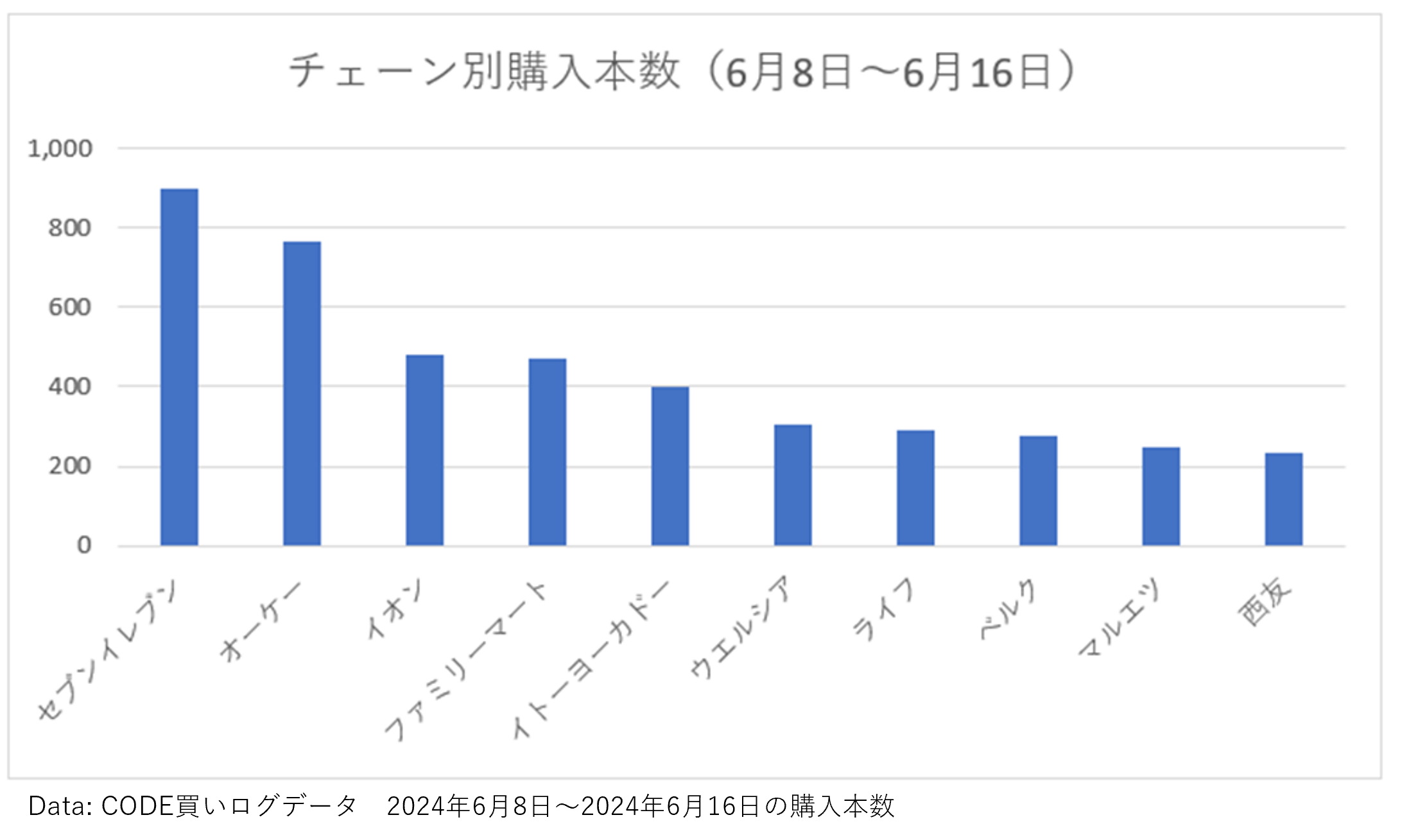 まず、6月8日~6月16日のチェーン別購入本数を見ていきます。チェーン別で見てみると、ほとんどのチェーンがコンビニか、スーパーです。ドラッグストアはウエルシアのみランクインしており、ディスカウントストアはランクインしていません。