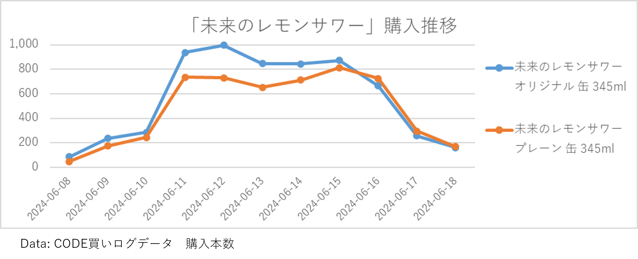 「未来のレモンサワー」の購入推移を見てみると、6月16日あたりから購入が減り始め、6月17日には一気に購入本数が減少しています。SNSで噂されているだけではなく、CODEのデータで見ても売り切れ間近であることは間違いないでしょう。