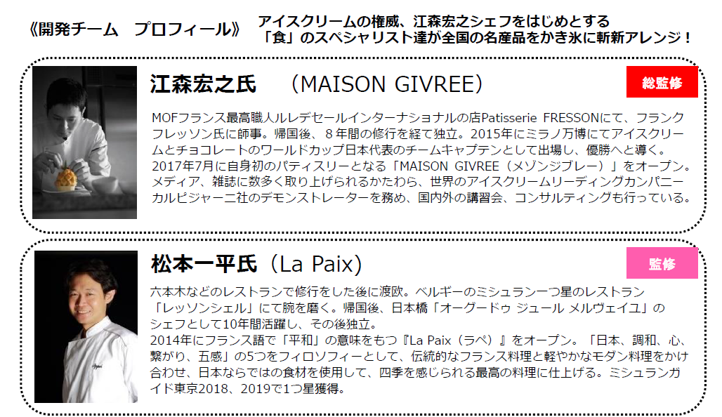 新たな特産品を起用したのは、熊本県のいちご「ゆうべに」と岩手県の夏いちごの「リアスターベリー」そして島根県の「干し柿」です。果肉の中まで真っ赤なゆうべには、同じく熊本県の特産品であるヨーグルトと掛け合わせて甘酸っぱい味わいに、岩手県のリアスターベリーはイタリア・シチリアの伝統スイーツ“カッサータ”風のかき氷に仕上げました。そして島根県の干し柿は、チーズとシナモンを添えたまるでフレンチ料理のような豪華なかき氷となり一口食べれば驚く味わいです。