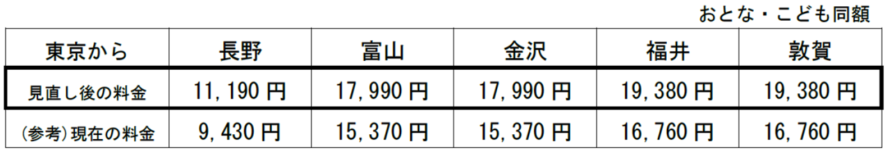 東京・上越妙高間の乗車区間及び上越妙高・敦賀間の乗車区間のそれぞれの区間に対する次表に定める額を合計した額(単位/円)
