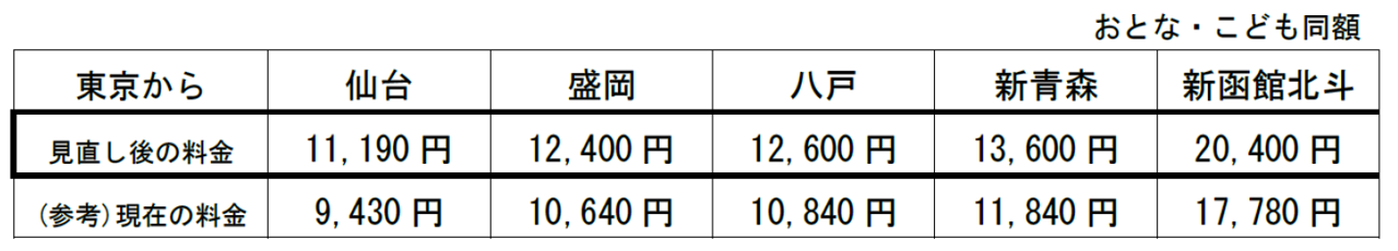東京・新青森間の乗車区間及び新青森・新函館北斗間の乗車区間のそれぞれの区間に対する次表に定める額を合計した額