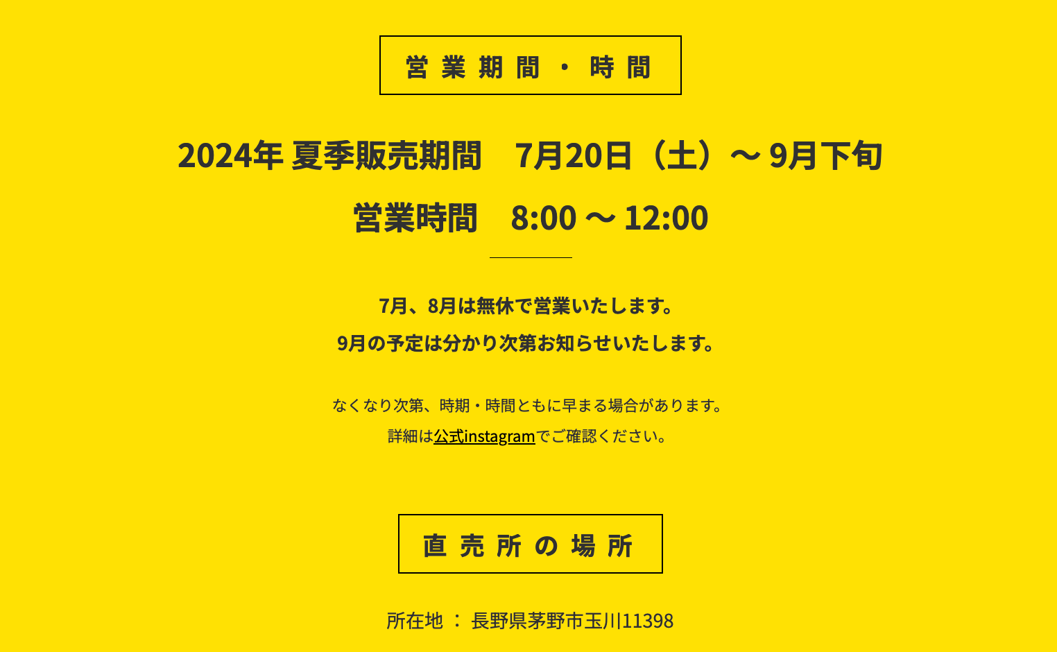 「超」がつくほどのド新鮮な朝採れの生とうもろこしを最高の状態で食べて欲しい!八ヶ岳にあるハマラノーエンの畑に採れたて超ド新鮮な生とうもろこしが味わえるハマラハウスは7月20日からオープンします。私たち生産者から直接ご購入いただけるほか、収穫体験などのメモリアルなイベントも開催いたします!SNSや当WEBサイトで開催日時をチェックしていただけると嬉しいです。畑周辺は景観も良く、魅力的なお店がいくつもあるエリアです。朝の清々しい空気を楽しみながらドライブ、ツーリング、散策ついでにぜひお立ち寄りください。
